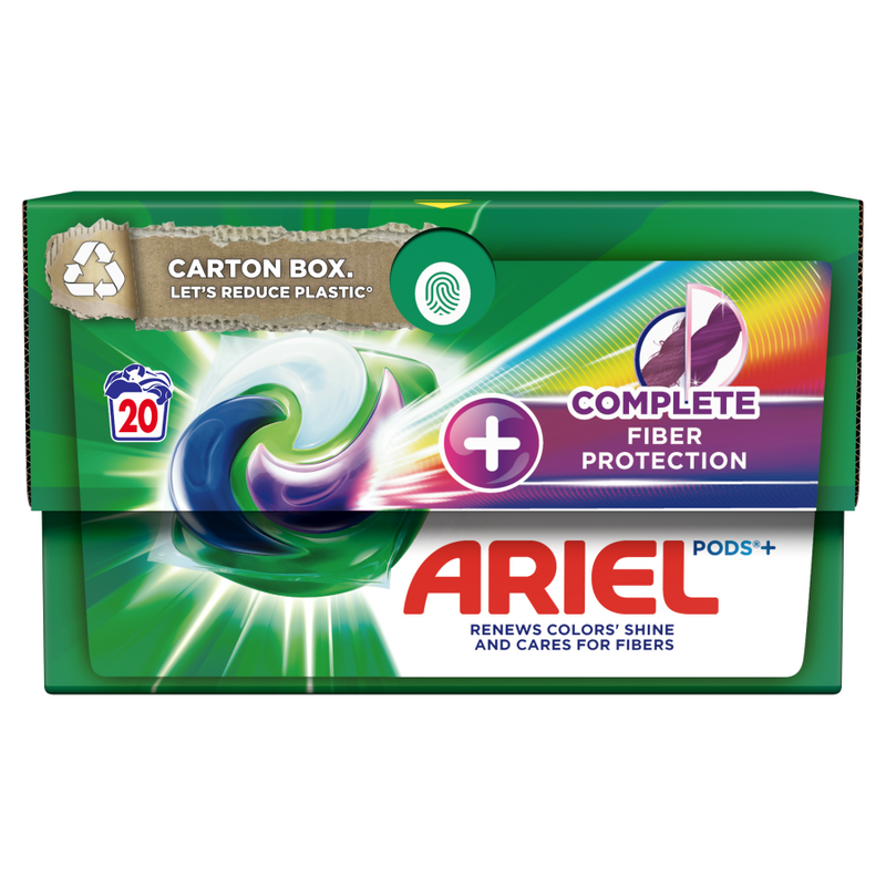 Ariel, a brand recommended by Whirlpool, Electrolux, Candy and Beko, presents Ariel PODS+ laundry capsules, with +Complete Fiber Protection technology. They have an additional purple chamber and restore the brilliance of colours while protecting the fibres. Ariel laundry capsules are designed for low temperature washing, with the unique Cool Clean technology. Their coating dissolves on contact with water, releasing the unique power of dirt removal technology, thanks to which Ariel PODS+ Complete Fiber Care capsules provide a thorough and effective clean. What's more, Ariel laundry capsules can help reduce plastic waste thanks to the ECOCLIC cardboard box, which is recyclable ((PL)(HU)(CZ)(SK)(SI)(EE)(LT)(LV)). The box contains a maximum of 5% plastic and is designed to keep PODS capsules in good condition. Warning: This product can be harmful and cause serious injuries. Always keep Ariel PODS+ laundry capsules out of the reach of children. For more information, visit keepcapsfromkids.eu.