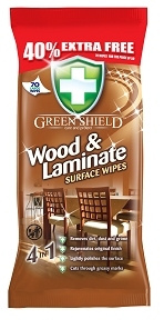 Green Shield Wood & Laminate Surface Wipes to nawilżone chusteczki do czyszczenia, konserwacji i pielęgnacji powierzchni drewnianych, drewnopodobnych i laminowanych. Ściereczki usuwają brud, kurz, ślady po odciskach palców, tłuste zanieczyszczenia z mebli i podług nie pozostawiając smug. Doskonale czyszczą codzienne zabrudzenia. Delikatnie polerują i nabłyszczają powierzchnie, pozostawiając meble lśniąco czyste o przyjemnym zapachu.