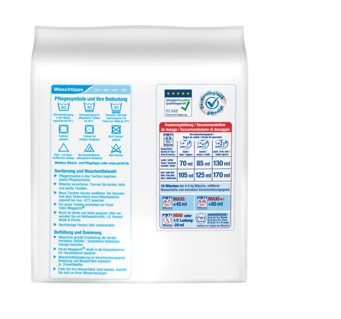 PERSIL Sensitive Megaperls – Delikatny proszek do prania dla skóry wrażliwej Nic nie jest tak blisko skóry jak pranie. Dlatego PERSIL Sensitive Megaperls łączy najlepszą moc prania z najlepszą kompatybilnością ze skórą. Został opracowany i zatwierdzony* we współpracy z dermatologami jako produkt przyjazny dla skóry i alergików, dlatego nadaje się również jako proszek do prania dla niemowląt i dzieci. Formuła jest wzbogacona o hipoalergiczne perfumy i zawiera kojący zapach aloesu i naturalnego mydła. Dzięki temu detergent do prania jest szczególnie delikatny i nie szkodzi mikrobiomowi skóry. Zaleca się pranie ubranek dziecięcych przed pierwszym założeniem, aby usunąć chemikalia tekstylne i inne potencjalnie szkodliwe substancje. Szczegółowe zalety produktu: Zawiera składniki pochodzenia naturalnego, takie jak aloes i naturalne mydło Szanuje mikrobiom skóry Wykonany z hipoalergicznych perfum Testowany dermatologicznie* i certyfikowany przez ECARF** 16 prań *Testowane przez Henkel AG & Co. KGaA, badanie nr. 2000554-1 „Pojedynczy test naskórkowy (24-godzinny test płatkowy)”, n=22 (Niemcy, 2020)**Udowodniona jakość produktu przyjaznego dla alergików, certyfikowana przez Fundację Europejskiego Centrum Badań nad Alergiami (ECARF), Certyfikat nr 6309 (Niemcy, 2021) Instrukcja użycia: Zawsze sprawdzaj instrukcję dawkowania na opakowaniu. Dawkowanie zależy od wielkości pralki, twardości wody i stopnia zabrudzenia prania. Trzymaj z dala od dzieci. PERSIL pozostaje Persil, ponieważ PERSIL nie pozostaje PERSIL Od ponad 110 lat PERSIL cieszy się ogromną popularnością i zaufaniem milionów konsumentów. Kiedy został wprowadzony na rynek w 1907 roku jako pierwszy samoczynnie działający proszek do prania, PERSIL wyprzedził swoje czasy i od tego czasu wyznaczył kamienie milowe w rozwoju nowych i zrównoważonych detergentów. Wszystkie produkty firmy zapewniają znaczącą wartość dodaną, łącząc najwyższą wydajność z odpowiedzialnością za ludzi i środowisko, umożliwiając efektywne wykorzystanie zasobów, takich jak energia i woda.