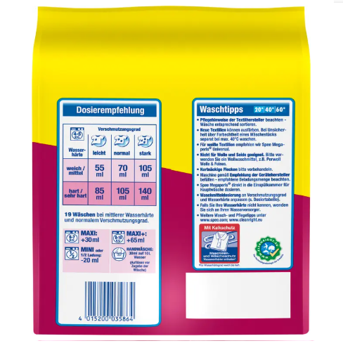SPEE Megaperls Color 4 w 1 – Proszek do prania dla czystości, blasku, świeżości i zrównoważonego rozwoju. SPEE Megaperls Color 4 w 1 łączy w sobie cztery potężne korzyści: czystość, blask, świeżość i zrównoważony rozwój. Dzięki technologii czyszczenia Spee, proszek do prania zapewnia blask i długotrwałą świeżość! SPEE 4 w 1 niezawodnie czyści i usuwa plamy z ubrań, nawet podczas prania w niskich temperaturach, począwszy od 20°C. Saszetka nadaje się w 100% do recyklingu*, a formuła zawiera 90% biodegradowalnych składników zapachowych**. Szczegóły korzyści produktu: Formuła zapewniająca czystość, blask, świeżość i zrównoważony rozwój Zwiększona moc prania Długotrwała świeżość Skuteczny we wszystkich cyklach prania od 20 do 60°C Niezawodne usuwanie plam nawet w niskich temperaturach Chroni kolorowe pranie Formuła zawiera 90% biodegradowalnych składników zapachowych** *Z wyjątkiem etykiety** Na bazie składników organicznych - zgodnie z OECD 301/302 Zastosowanie: Ten wszechstronny detergent nadaje się do prania w temperaturach od 20°C do 60°C. Wydajna formuła umożliwia dobre rezultaty prania nawet w temperaturze 20°C. Instrukcje dozowania zależą od wielkości pralki, twardości wody i stopnia zabrudzenia prania. SPEE - spektakularny Dzięki naszym produktom obiecujemy Ci bez zbędnych dodatków, ale dokładnie to, czego szukasz: spektakularnie czyste pranie w najlepszej cenie. Niezależnie od tego, jaka plama obecnie nęka Twoje ulubione ubrania, jesteśmy pewni, że mamy dla Ciebie odpowiednie rozwiązanie. I aby tak pozostało, wiele osób pracuje za kulisami, stale badając nowe sposoby na dalszą poprawę efektów prania. Obiecujemy.