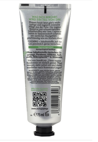Jean&Len Intensywnie odżywczy krem do rąk wegański Rozmaryn i Imbir 75 ml z Niemiec