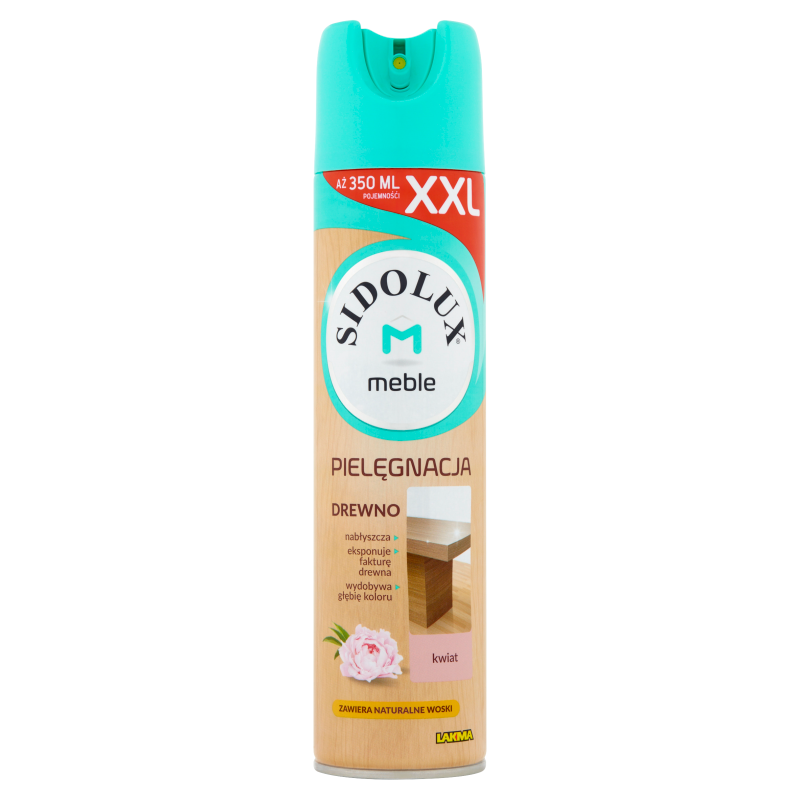 Sidolux M - pielęgnacja aerozol do mebli - kwiat Doskonale pielęgnuje meble z drewna i forniru, wydobywając ich naturalne piękno. - Głęboka pielęgnacja Dzięki innowacyjnej formule z naturalnymi woskami preparat intensywnie pielęgnuje drewno, nadając mu nieskazitelny wygląd i nie pozostawiając smug. - Kompleksowa ochrona Regularne stosowanie produktu pozwala opóźnić proces starzenia się czyszczonych powierzchni. - Wysoki połysk Preparat idealnie nabłyszcza powierzchnię, wydobywając głębię koloru oraz eksponując naturalną fakturę drewna. - Ochrona skóry dłoni Łagodne składniki na bazie surowców kosmetycznych nie wysuszają skóry dłoni, ale pielęgnują ją i mają właściwości kojące. - Wygoda stosowania Produkt jest wyjątkowo wygodny w użyciu, wydajny i nie spływa z pionowych powierzchni. - Wyjątkowy zapach Starannie wyselekcjonowane kompozycje zapachowe wykorzystywane w preparacie, pozwalają na długo cieszyć się zapachem czystości w całym domu.