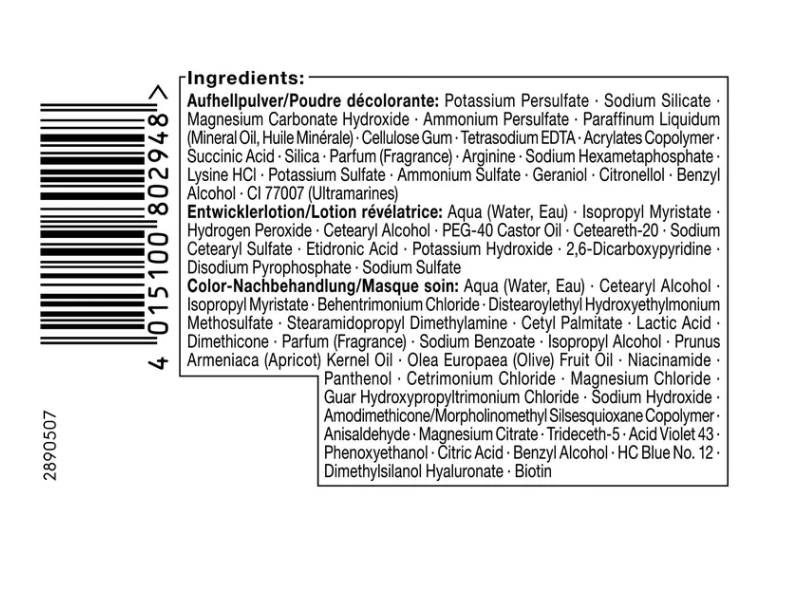 Składniki : Aufhellpulver/Poudre décolorante: Potassium Persulfate, Sodium Silicate, Magnesium Carbonate Hydroxide, Ammonium Persulfate, Paraffinum Liquidum (Mineral Oil, Huile Minérale), Cellulose Gum, Tetrasodium EDTA, Acrylates Copolymer, Succinic Acid, Silica, Parfum (Fragrance), Arginine, Sodium Hexametaphosphate, Lysine HCI, Potassium Sulfate, Ammonium Sulfate, Geraniol, Citronellol, Benzyl Alcohol, CI 77007 (Ultramarines) Entwicklerlotion/Lotion révélatrice: Aqua (Water, Eau), Isopropyl Myristate, Hydrogen Peroxide, Cetearyl Alcohol, PEG-40 Castor Oil, Ceteareth-20, Sodium Cetearyl Sulfate, Etidronic Acid, Potassium Hydroxide, 2,6-Dicarboxypyridine, Disodium Pyrophosphate, Sodium Sulfate Color-Nachbehandlung/Masque soin: Aqua (Water, Eau), Cetearyl Alcohol, Isopropyl Myristate, Behentrimonium Chloride, Distearoylethyl Hydroxyethylmonium Methosulfate, Stearamidopropyl Dimethylamine, Cetyl Palmitate, Lactic Acid, Dimethicone, Parfum (Fragrance), Sodium Benzoate, Isopropyl Alcohol, Prunus