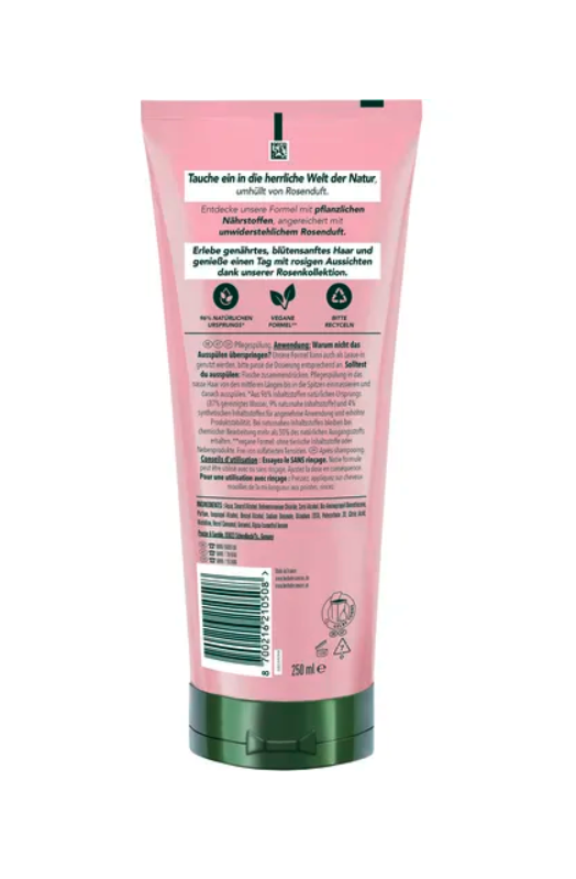 Dzięki naturalnym esencjom różanym zbieranym ręcznie na południu Francji oraz delikatnej, wegańskiej formule, odżywka skutecznie wzmacnia włosy, nie obciążając ich. Formuła bez silikonów i parabenów zapewnia lekkość i naturalną objętość, a kwiatowy zapach róży sprawia, że każda pielęgnacja włosów staje się prawdziwym rytuałem relaksu.