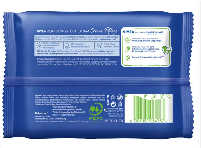 Chusteczki oczyszczające NIVEA 3-in-1 Cream Care Cleansing Wipes dokładnie oczyszczają, usuwają makijaż, a nawet wodoodporny tusz do rzęs, a także chronią naturalną równowagę wilgoci skóry. Te biodegradowalne chusteczki nie zawierają alkoholu. Odżywcza formuła z Eucerit, pantenolem i unikalnym zapachem kremu NIVEA jest wyjątkowo łagodna i odpowiednia dla wszystkich typów skóry — idealna do codziennego stosowania. Rezultat: miękka, zadbana skóra. Zgodność jest zatwierdzona dermatologicznie i okulistycznie. Ostrożnie zamknij opakowanie natychmiast, aby zapobiec wyschnięciu chusteczek. Praktyczne opakowanie zawiera 25 chusteczek oczyszczających do szybkiego i łatwego usuwania makijażu w domu lub w podróży.