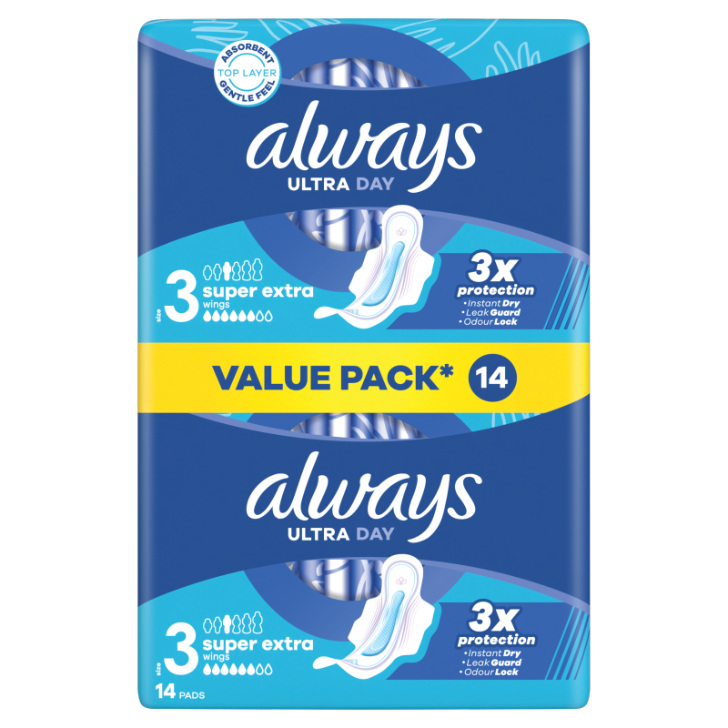 Wybierz odpowiednie rozwiązanie dla siebie, takie jak potrójna ochrona, którą zapewniają podpaski ALWAYS Ultra Super Extra (rozmiar 3). Podpaski Always z chłonną i delikatną powłoczką wchłaniają wilgoć w kilka sekund dzięki technologii InstantDry, a za sprawą technologii LeakGuard i OdorLock zapobiegają przeciekaniu i nieprzyjemnemu zapachowi. Wyjątkowe skrzydełka ComfortLock zaprojektowano tak, by zapewnić doskonałe dopasowanie do każdego rodzaju bielizny. Dla dodatkowej ochrony w nocy wypróbuj podpaski Always Night w różnych rozmiarach. Podpaski Always Ultra zostały zatwierdzone dermatologicznie przez Skin Health Alliance.