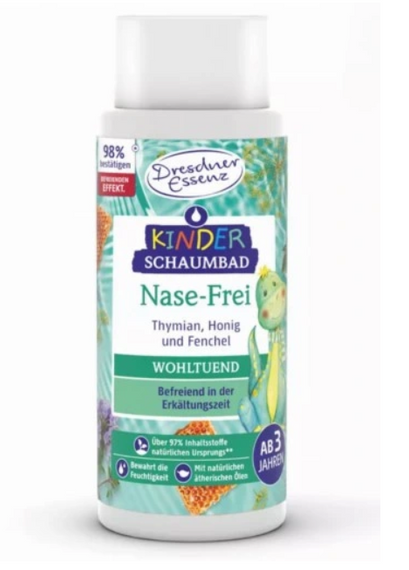 Płyn do kąpieli dla dzieci „NOS FREE” działa kojąco i udrażniająco w sezonie przeziębień i grypy. Cenne naturalne olejki eteryczne z tymianku i kopru włoskiego, a także miód, sprzyjają ogólnemu samopoczuciu i w połączeniu z wodą do kąpieli zapewniają uczucie ciepła. Formuła jest łagodna i odżywcza dla skóry, opracowana specjalnie dla wrażliwej skóry dzieci od 3. roku życia.
