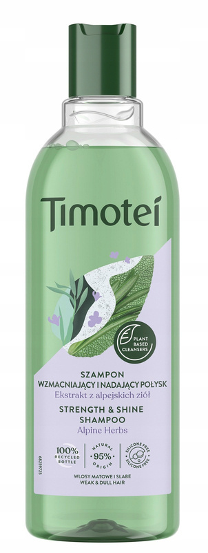 Wzmacniający Szampon do włosów to produkt do mycia i pielęgnacji włosów suchych i matowych, które w wyniku szkodliwego działania różnych czynników utraciły swój naturalny blask. Formuła szamponu została wzbogacona naturalnym wyciągiem z alpejskich ziół, dzięki któremu Timotei nie tylko skutecznie oczyszcza włosy i skórę głowy, ale również działa odżywczo na matowe kosmyki.